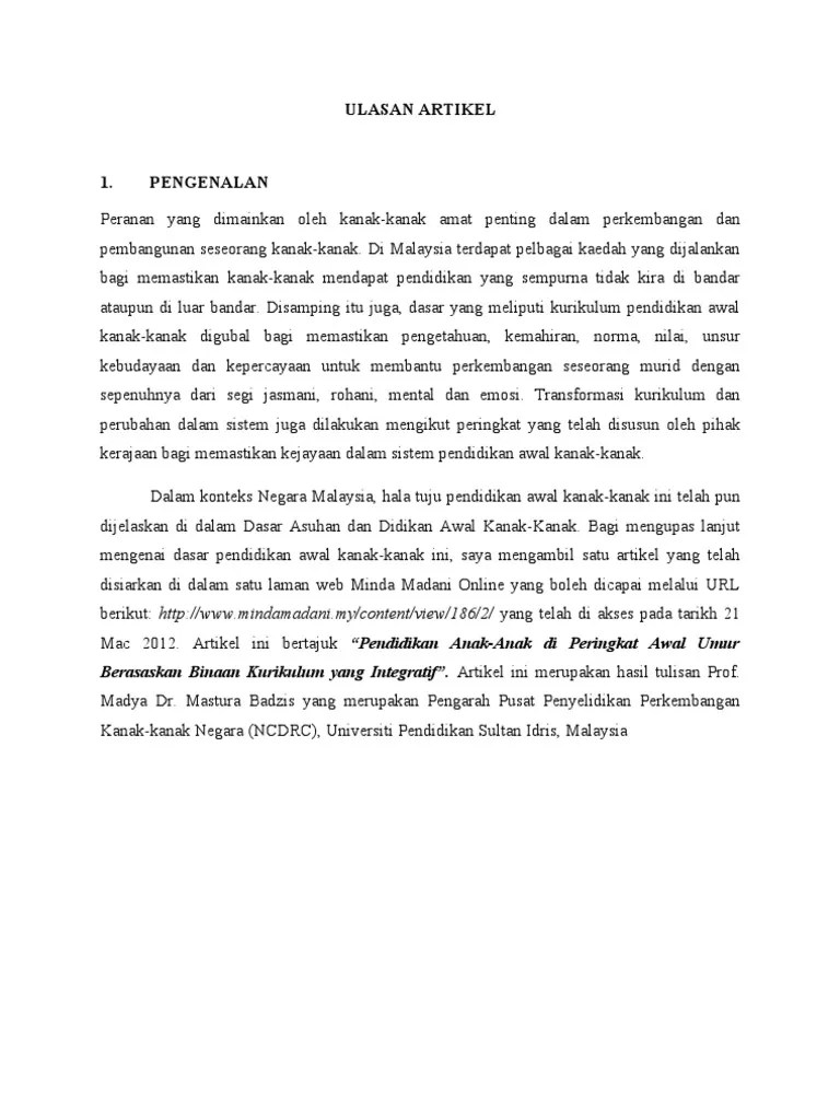 Tuliskan semua contoh penulisan yang ditulis dengan baik, sumbangan baru kepada . Ulasan artikel adalah ringkasan dan penilaian karya pengarang lain. Akrabkan diri dengan format dan gaya penulisan ulasan. Tarikh artikel diterbitkan/ nama jurnal/ bilangan dan sebagainya… Panduan penulisan ulasan artikel jurnal 1.