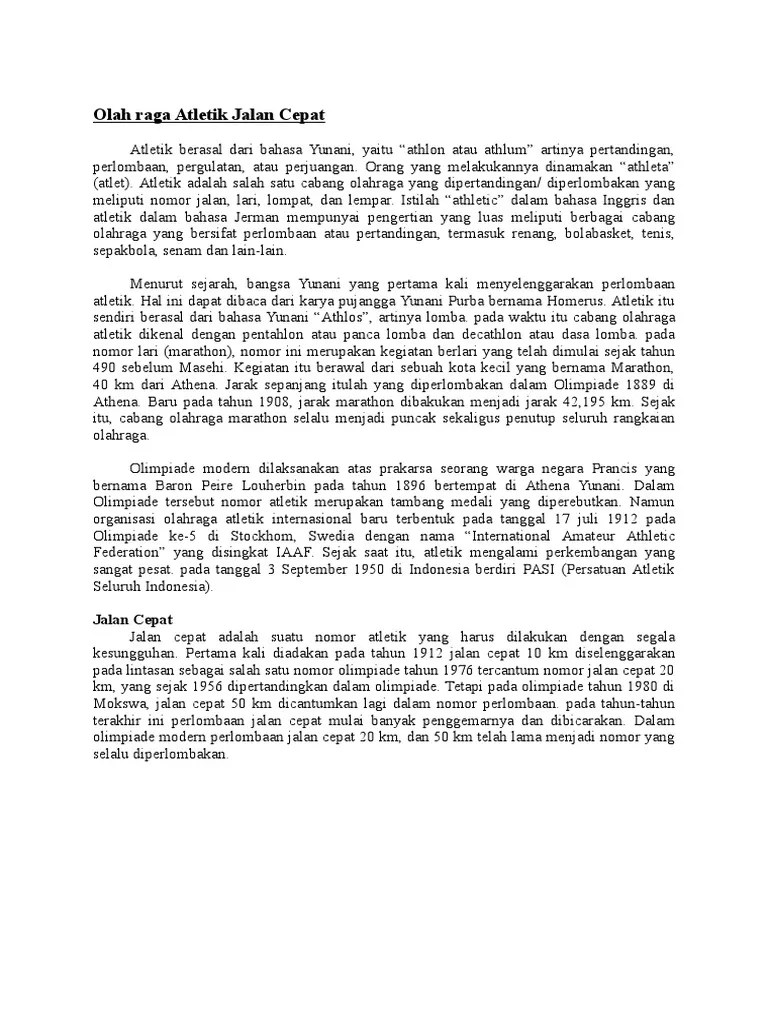 Menurut sejarah, bangsa yunani yang pertama kali menyelenggarakan perlombaan atletik. Lari jarak pendek · 4. Latar belakang sejarah atletik dari internasional. Pada perkembangannya, olahraga atletik mulai diperlombakan dalam. Jalan cepat juga sering ditandingkan dalam cabang olahraga atletik. Jalan cepat atau racewalking merupakan salah satu cabang olahraga atletik yang dilombakan pada olimpiade. Pada perkembangannya, pada tahun 1896 olahraga atletik ini sudah mulai . Atletik mengalami banyak perkembangan termasuk di indonesia. Atletik adalah event asli dari olimpiade pertama pada tahun. Hal ini dapat dibaca dari karya pujangga yunani purba . Jalan cepat termasuk ke dalam cabang olahraga atletik. Sejarah jalan cepat yang termasuk salah satu jenis olahraga atletik. Lomba jalan cepat event biasa adalah.